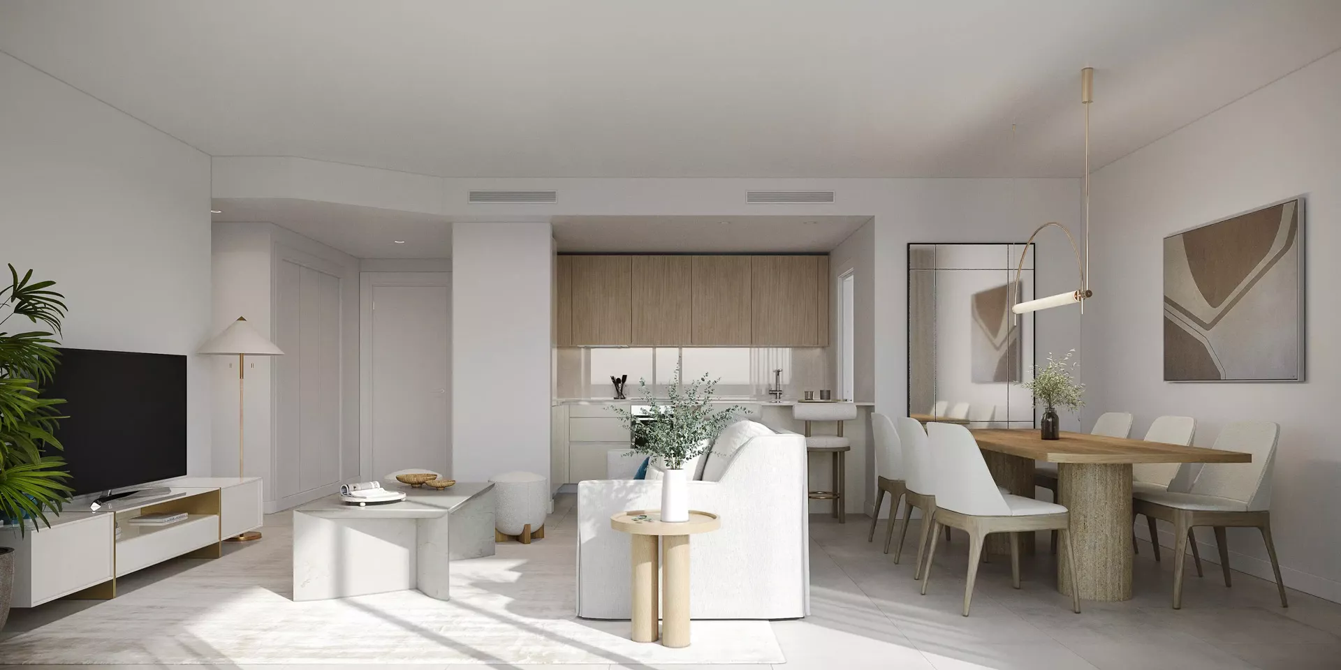 A lakásokat úgy tervezték, hogy a nappali, az étkező és a konyha egy tágas, nyitott életteret alkosson. A nagy üvegfelületeknek és a teraszkapcsolatoknak köszönhetően a lakások világosak és jól kihasználják a természetes fényt.
